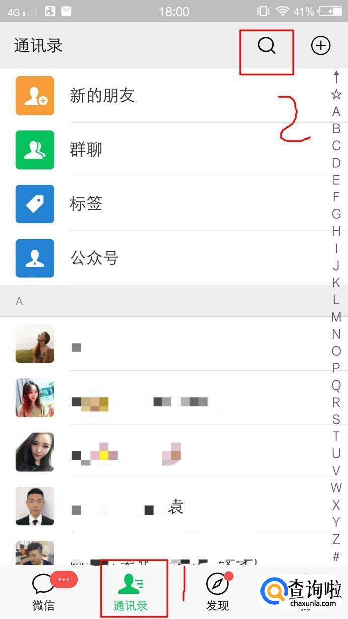 打开微信手机界面, 进入‘通讯录’界面,点击‘搜索图标’。