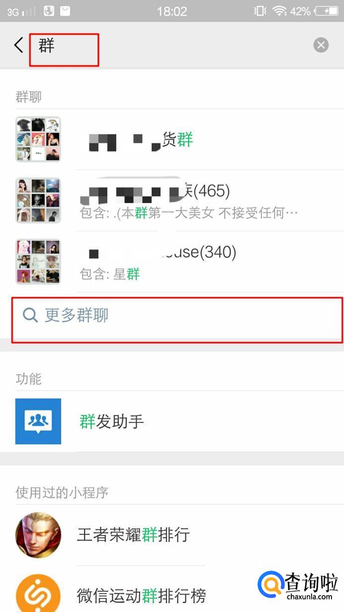 在搜索框里输入‘群’,然后点击‘更多群聊’。