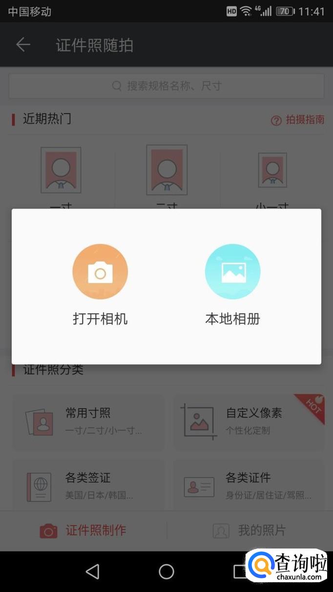授权登录后,进入“证件照随拍”,选择自己需要的尺寸后点击,如图则会弹出“打开相机”、“本地相册”的选择,根据自己的需要进行选择。