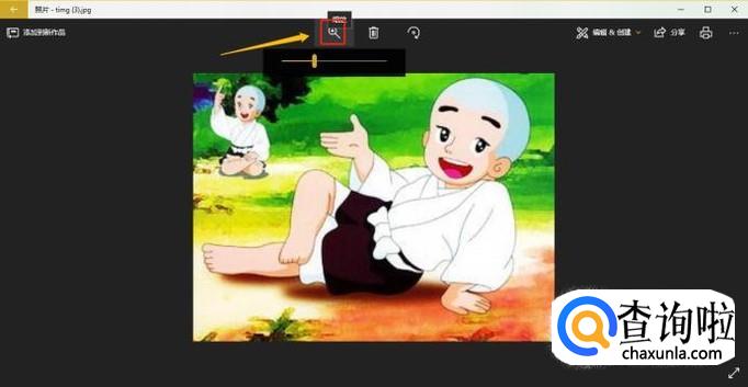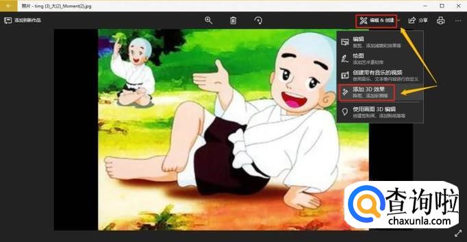 双击以后就可以放大此图片了,页面最上方找到放大图标还可以自由缩放,接着依次点击右上角的"编辑&创建"-"添加3D效果",如图;