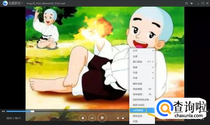 然后我们用电脑上安装的任意一款视频播放软件打开它,我们以迅雷看看为例,在播放界面点击鼠标右击选择"GIF图截取",如图