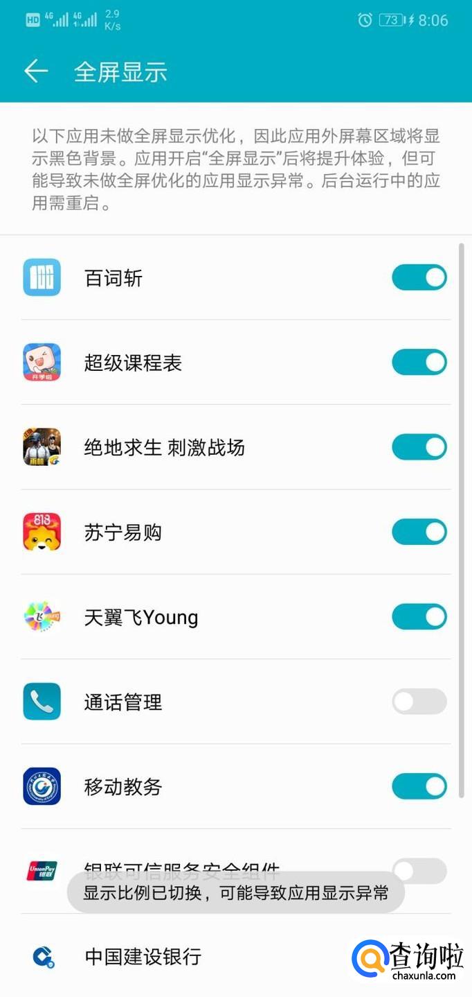 不论打开哪项应用的开关,系统都会提示“显示比例已切换,可能导致应用显示异常”,关于此提示小伙伴们无需担心