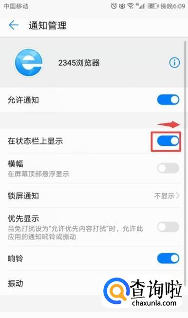 最后,我们将在状态栏上显示的开关向右滑动打开,这样我们就开启了消息显示提示了。