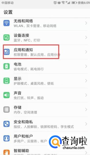 之后点击应用和通知,如图所示;