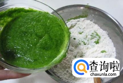 一般面粉和弄好的菠菜汁一起搅,记得菠菜里面水份多,再和面时一定要少放水,成团均匀后才开始做馒头。