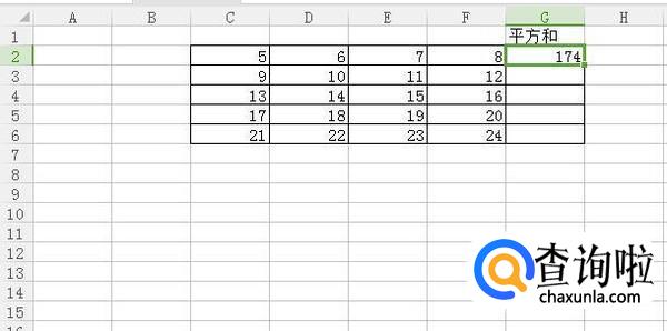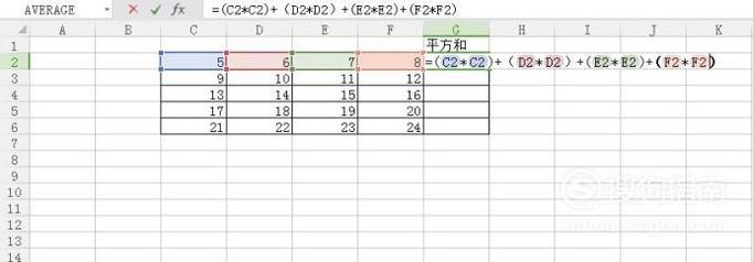 接着在G2输入公式=(C2*C2)+(D2*D2)+(E2*E2)+(F2*F2),如下图所示