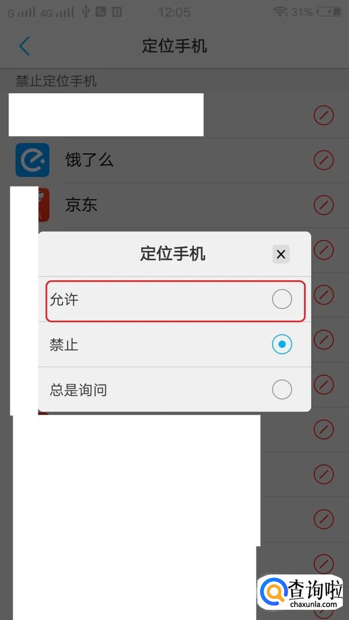 可以看到饿了么app处于“禁止定位”的行列里,如图所示,点击右侧的禁止图标,把权限由“禁止”改为“允许”就可以了。
