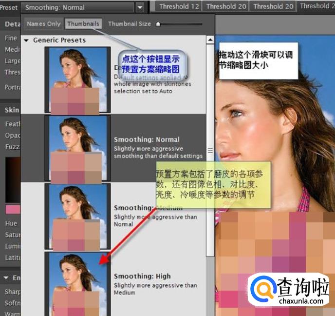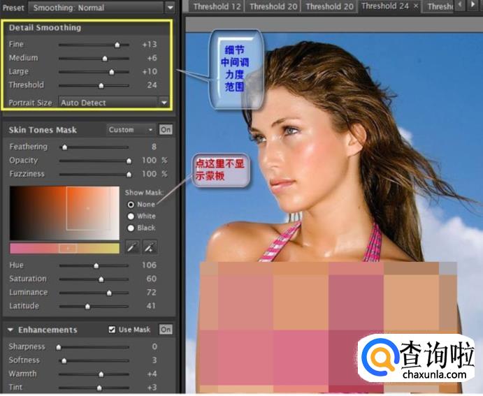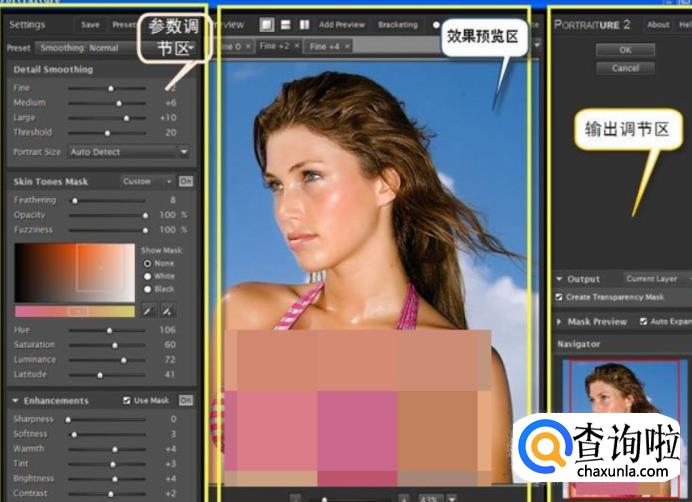 皮肤选择好后,我们再来到左边参数设置区最上面的模块进行精细调整,在这里可以精确调整磨皮后要保留的细节、中间调区磨皮的多少,磨皮的力度和范围。