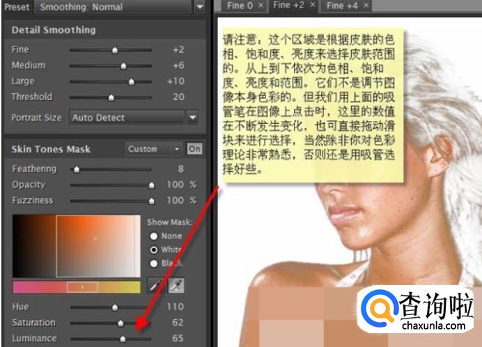 请注意:这个区域是根据皮肤的色相、饱和度、亮度来选择皮肤范围的。从上到下依次为色相、饱和度、亮度和范围。它们不是调节图像本身色彩的。但我们用上面的吸管笔在图像上点击时,这里的数值在不断发生变化,也可直接拖动滑块来进行选择,当然除非你对色彩理论非常熟悉,否则还是用吸管选择好些。
