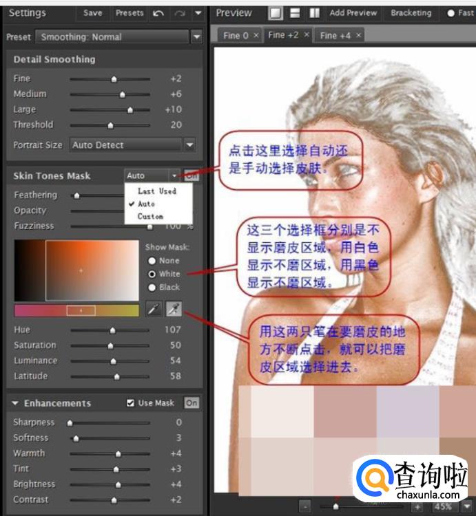 精细调整的第一步是选择皮肤,这个软件最大的优势是它能自动识别皮肤,通常情况下,我们用左边中间区域中的吸管笔在要麻的地方点击,就可以把皮肤选择进去了。