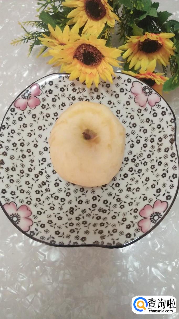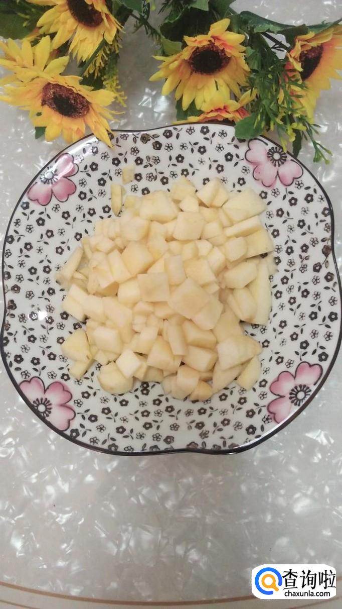 准备一个大红苹果,将苹果去皮后,切成小丁儿,苹果核扔掉不要。最好选择那些甜味比较浓的红富士苹果,青苹果有点酸,小孩子不太喜欢。