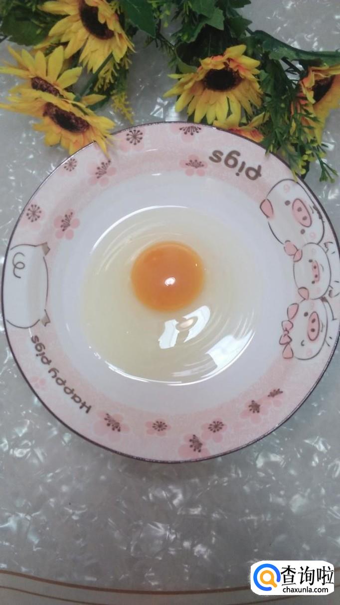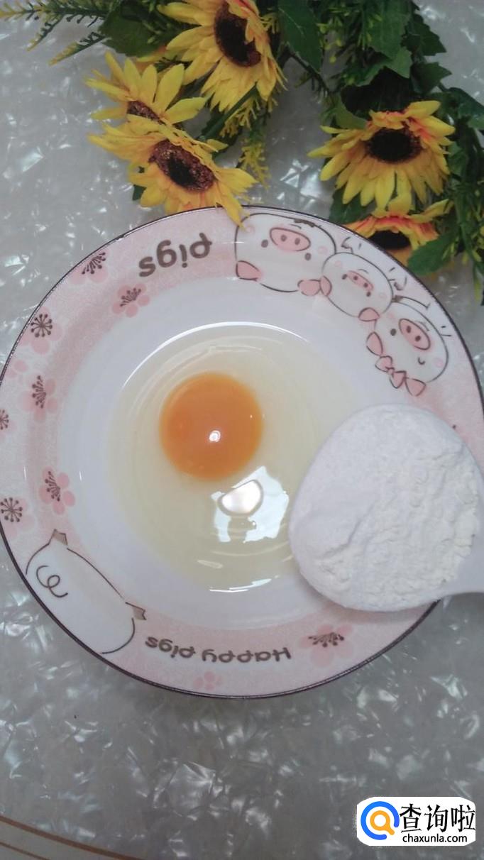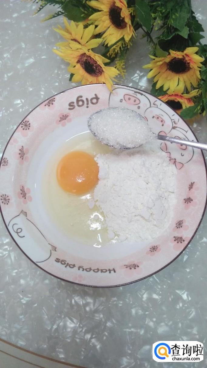 碗中打入一个鸡蛋,加入一大勺面粉。