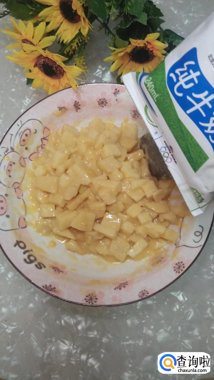 倒入半袋纯牛奶,搅拌成稀糊状,比酸奶状稍微稠一些,这样可以将苹果小丁儿粘连在一起。