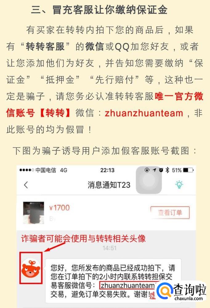 冒充客服让你缴纳保证金,如果有“转转客服”的微信或者QQ加你为好友并告知您需要缴纳保证金抵押金等,这种一定是骗子。