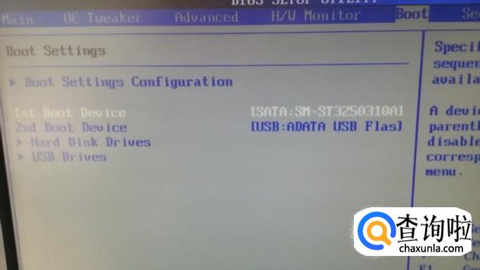 可以看到是硬盘为第一启动设备,U盘第二,我们进入第一启动设备设置