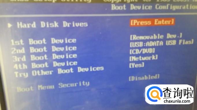 这个版本的BIOS里U盘是归类于硬盘的,所以进入“hard disk drives”选项