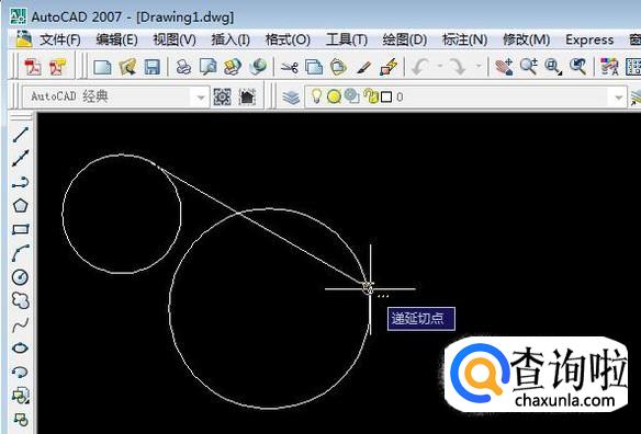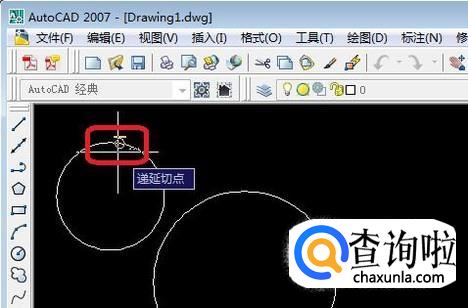 光标移到第一个圆上,如图所示,出现“递延切点”的标志,点击一下,直线的第一点就确定了。