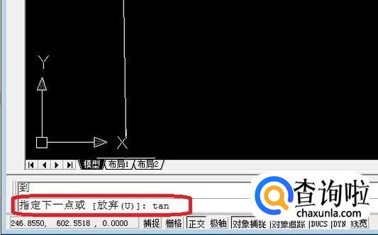 此时指定直线的第2点,在命令栏中输入“tan”,按回车键,然后移动光标到第2个圆任意一点,都会出现递延切点的标志。