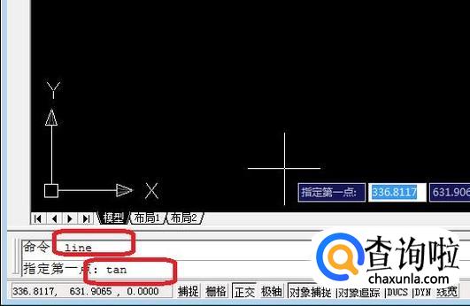 在底部命令栏中输入直线命令“line”,按回车键,接下来指定直线第一点,我们输入命令“tan”(相切),按回车键。