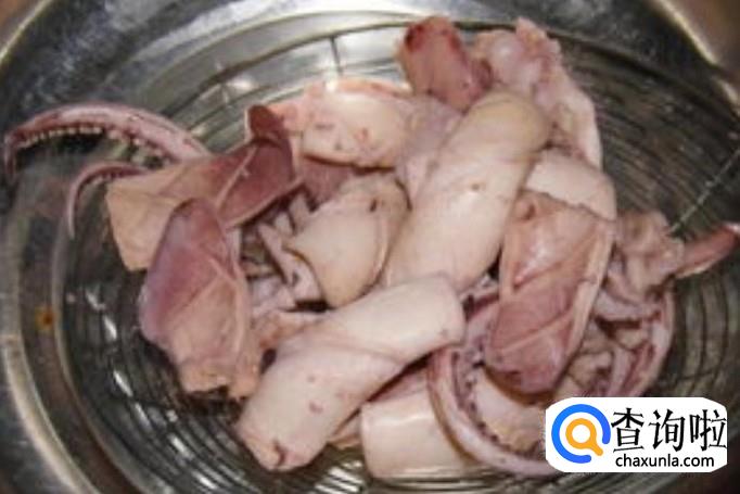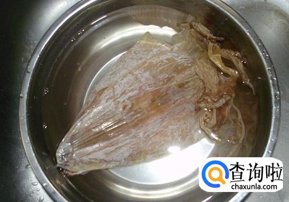 我们要先把干鱿鱼用清水洗净,然后用热水浸泡或者放在锅里用热水煮滚,煮软后捞出切成小块。