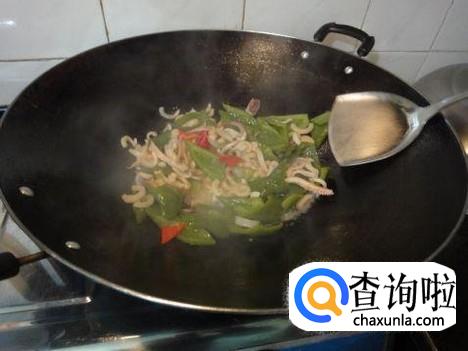 然后我们先把切好的鱿鱼条放入锅里面炒,然后加入青椒丝,倒入一些盐、酱油,倒半碗水就可以出锅了。
