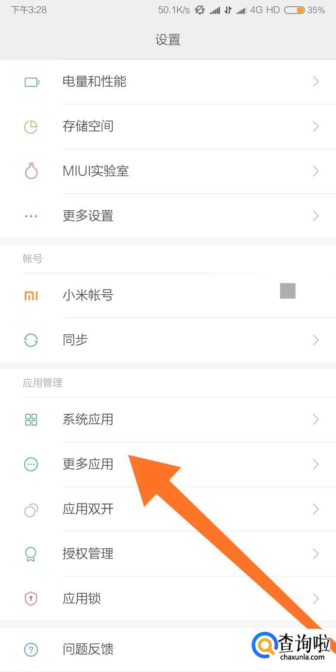 然后点击进入“应用管理”设置分组下方的“更多应用”选项。