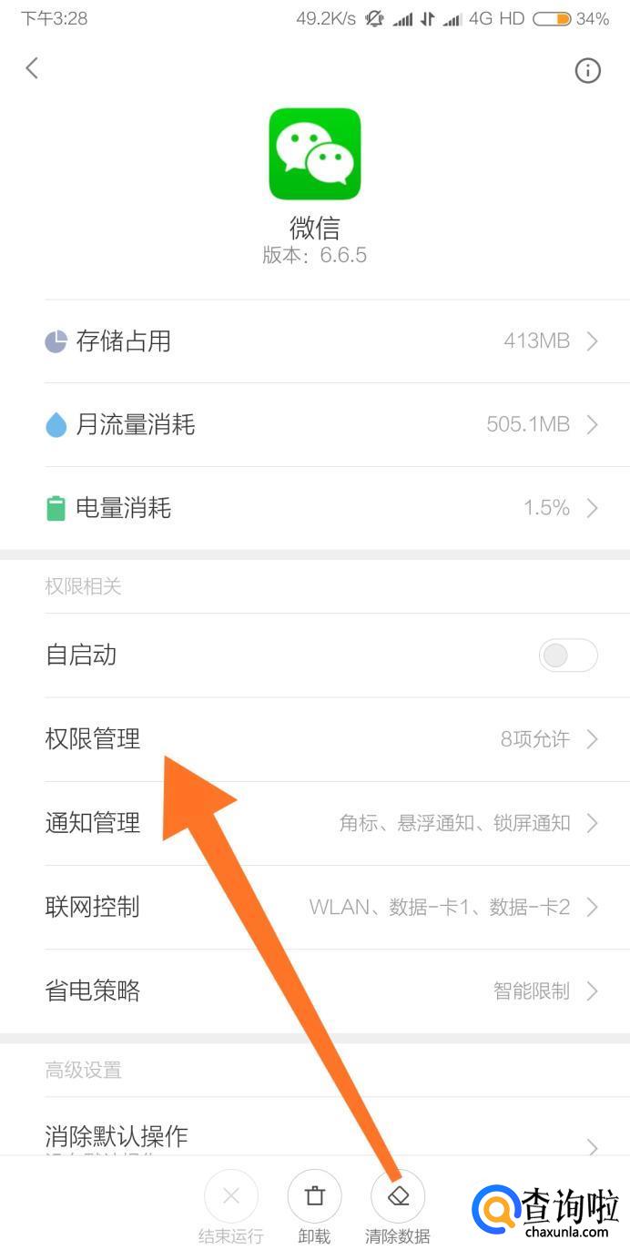 进入到应用程序详情页面后,点击进入微信的“权限管理”。