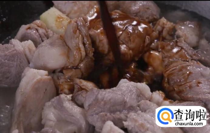 然后倒入羊肉,加料酒,再倒入煮好的酱油汤,翻炒几下。