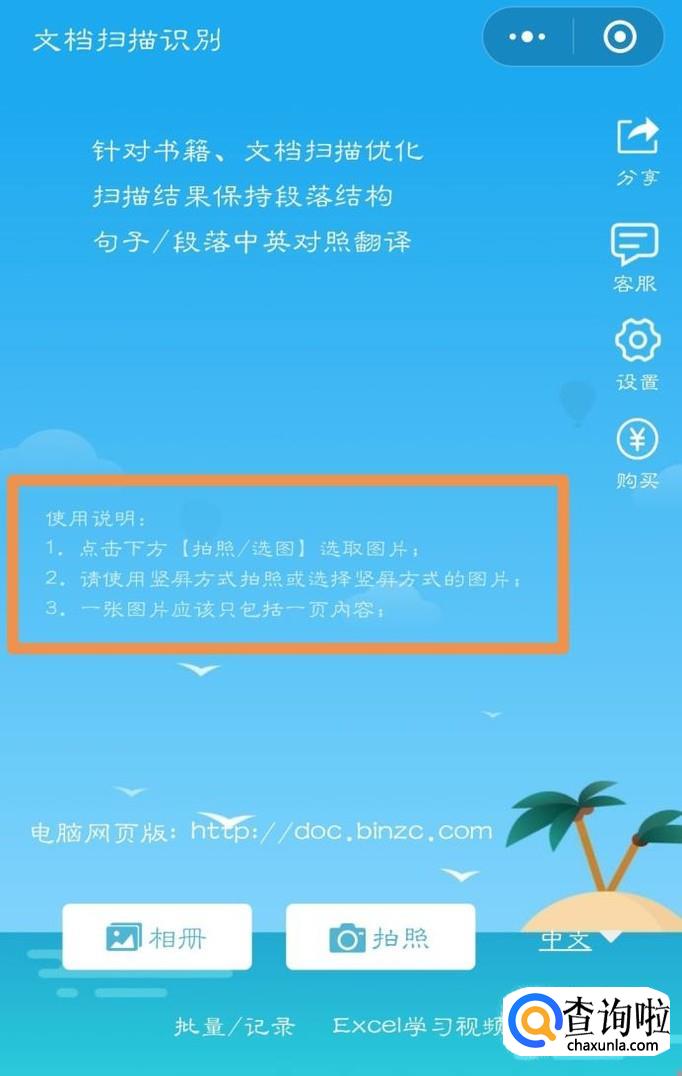 最后点击进入小程序,应选择相册或者拍照进行翻译。下图的框内是这个小程序的详细使用方法。