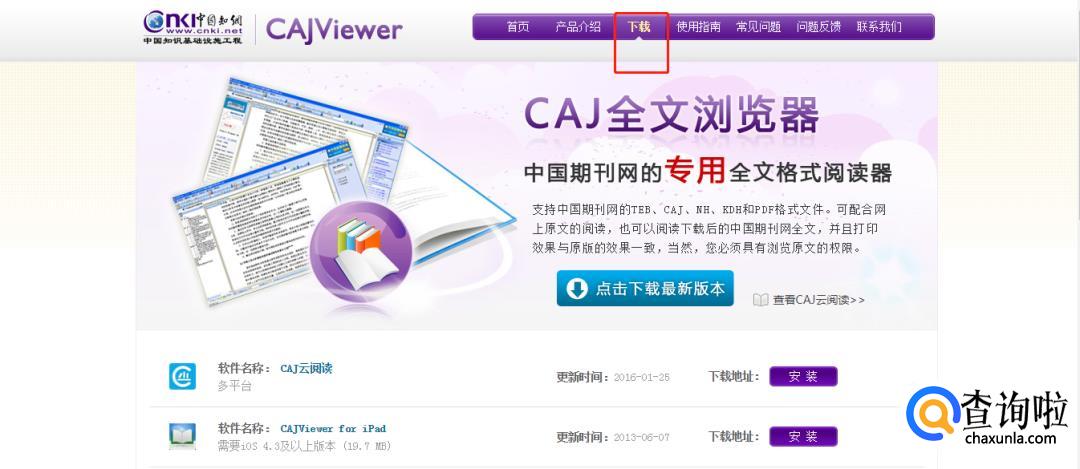 点击上方的菜单栏中的【下载】,进入caj阅读软件的官方下载列表。