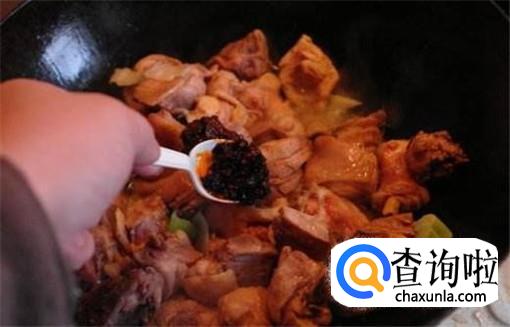然后将适量的食用油倒入锅中,再倒入鸡肉开始爆炒,期间加入三勺豆瓣酱,继续翻炒,加水煮制。