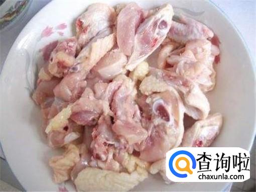 然后,我们将买来的整鸡洗净,然后切成小块,用料酒和水淀粉进行初步的腌制。