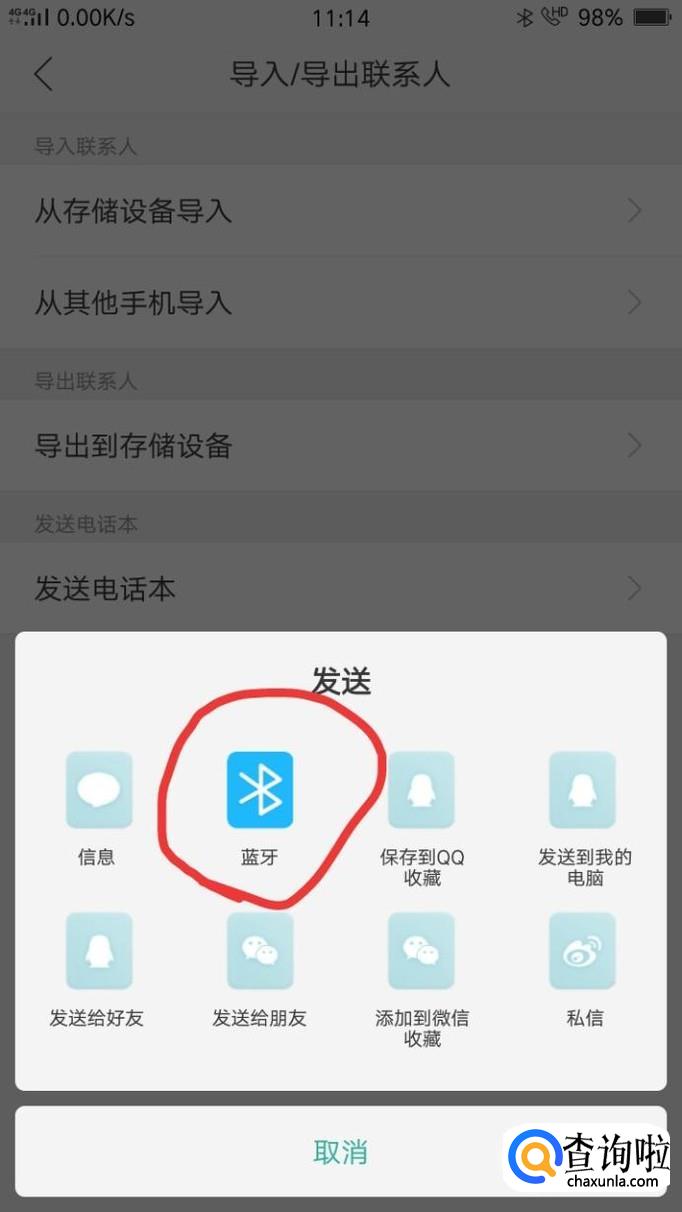 点击“蓝牙”,这时即可把电话本发送到已建立蓝牙连接的手机上了。