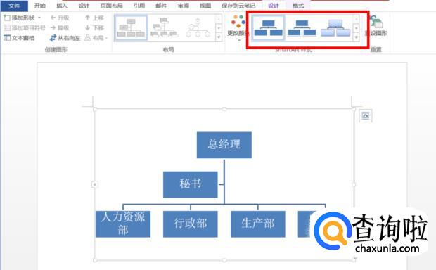 点击工具栏“设计”>“SmartArt图形”,选择合适的样式即可。