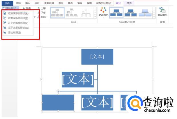如果想要添加形状结构,依次点击“设计”>“添加形状”,添加形状到合适的位置即可。