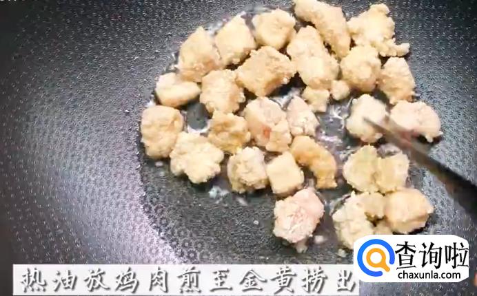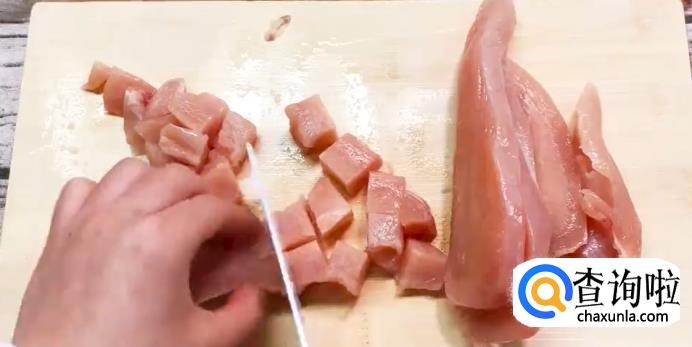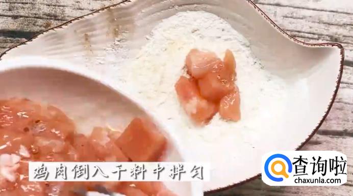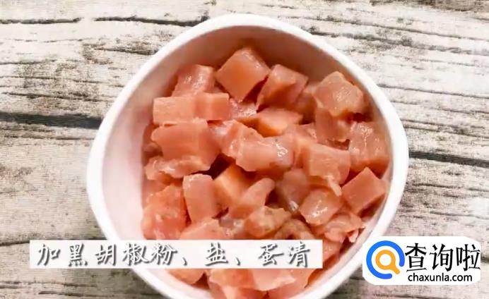 在鸡胸肉块中,加入黑胡椒粉、盐、蛋清拌匀,拌匀后腌制30分钟。