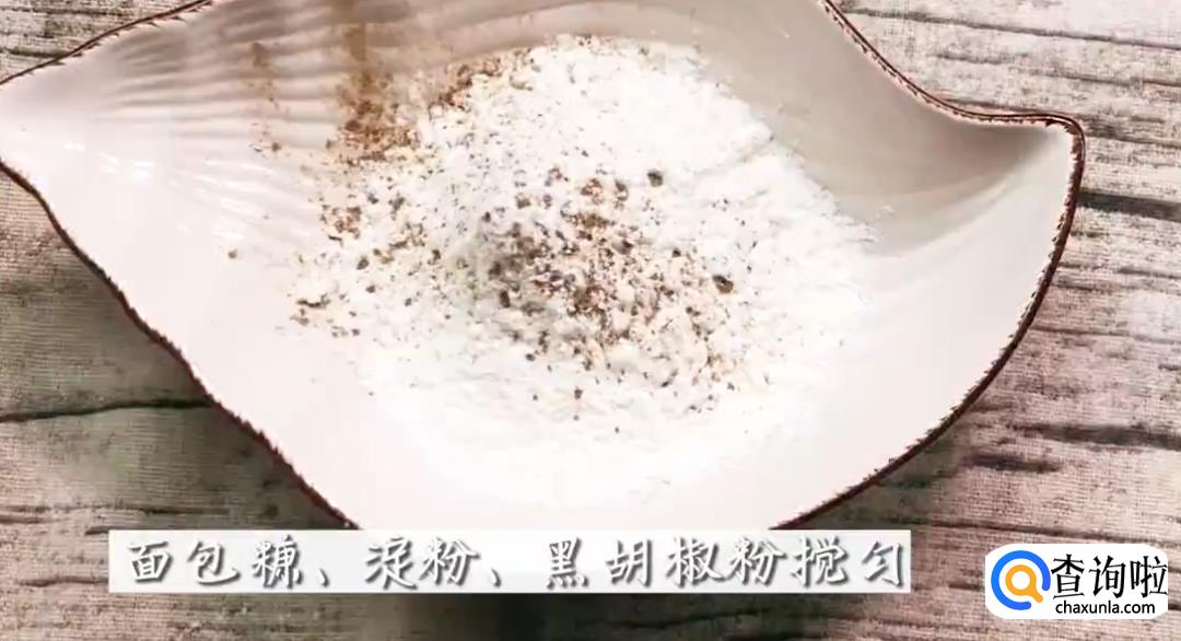 另取一个干净的碗,做干料:放入面包糠、淀粉、黑胡椒粉搅匀。