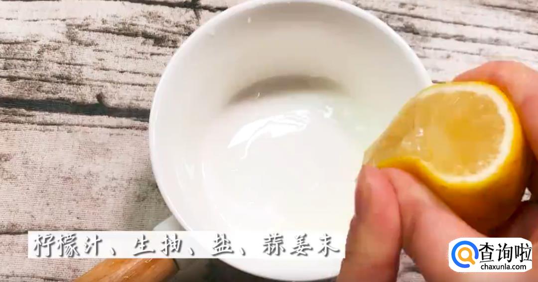 取一个干净的碗,做酱汁:放入柠檬汁、生抽、盐、姜蒜末、蜂蜜、淀粉、芝麻油和水搅匀。