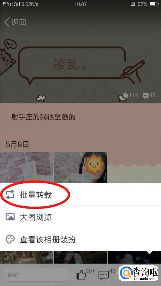 进入单独的具体相册之后,点击右下角由三个点组成的按钮,弹出图二界面之后,点击批量转载。
