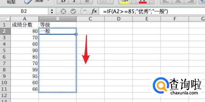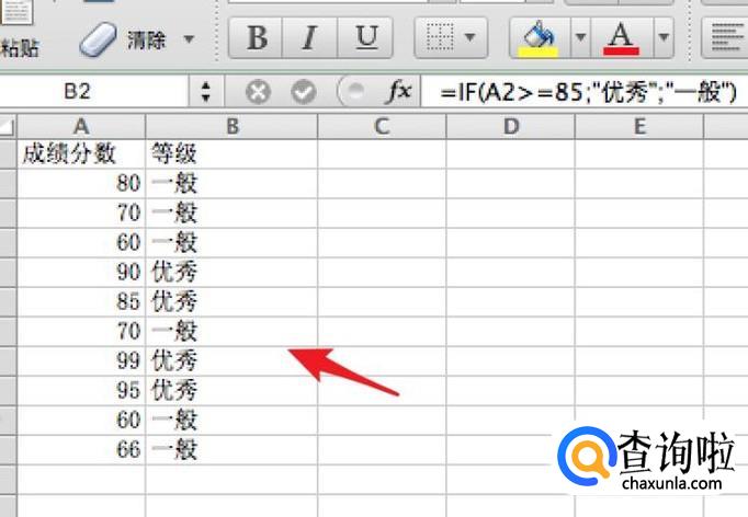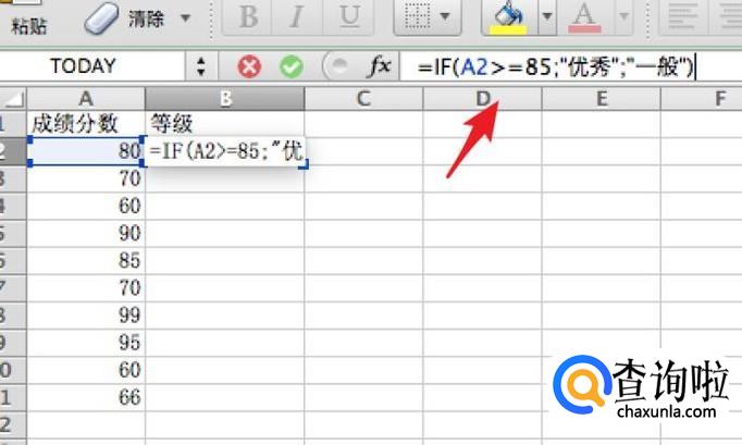 =IF(A2>=85;"优秀";"一般" ,