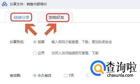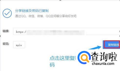 点击该图标以后,可以看到共有两种分享方法,一种是直接发送给网盘好友,这个方法相对简单,就和微信上发送文件是一样的;如果选择链接分享,那么创建一个链接以后将此链接连同对应的密码(注:密码自动生成)直接发送给他人即可;