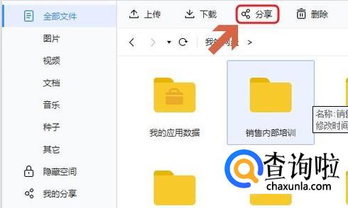 那么以后如果想要将自己网盘里的某些文件共享给他人该如何操作呢?首先我们选中打算分享的文件或者文件夹,然后页面上方即可弹出“分享”图标;