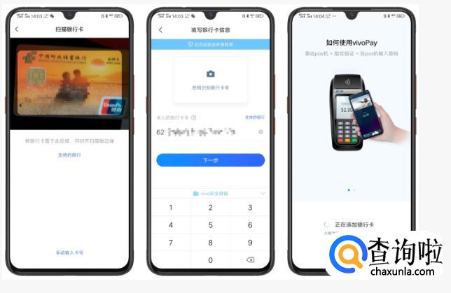 然后给自己的银行卡拍照识别银行卡号,然后输入银行卡预留手机号码和取款密码即可,然后耐心等待开通vivo Pay,最后只需要验证预留手机号的验证码即可,然后我们就开通成功了。