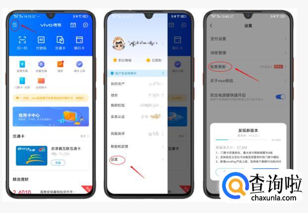 那么这么棒的vivo Pay究竟应该如何开通呢?首先我们需要将vivo钱包更新到最新版本,具体操作步骤是点击左上角三横,然后选择设置,然后点击检查更新并更新vivo钱包即可。