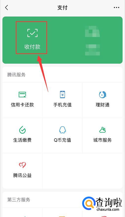 在支付页面中点击【收付款】,如下图所示;