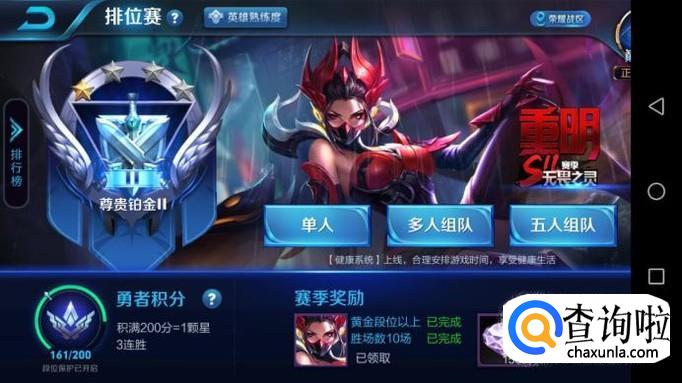 如果我们自己的技术不够好的话,那么就可以卖卖萌或者找熟人一起开黑,这样胜利的概率就会大一点,上升到铂金的可能性就会大一些。