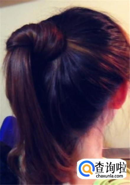 将所有的头发往后聚拢,扎成一个高马尾辫,记住了,一定要高马尾辫哦,头顶的头发自己整理的稍加蓬松一些,不然显脸大且有些拘谨。