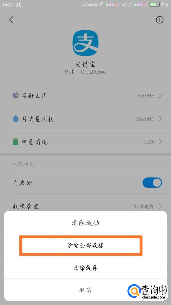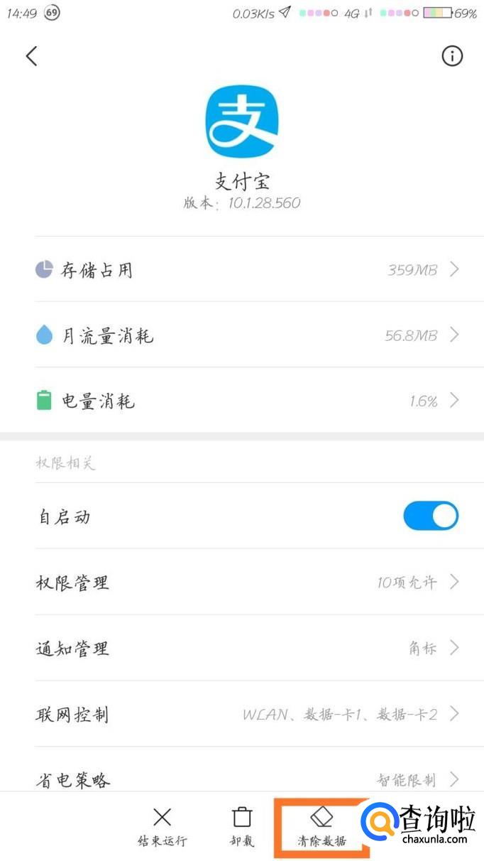 点击进入,选择下方的"清除数据",然后在子菜单里面点"清除全部数据",再打开支付宝重新登陆就行了。
