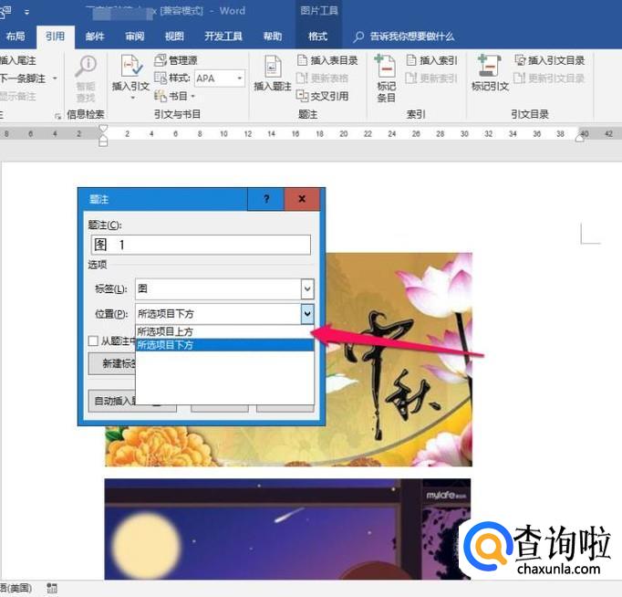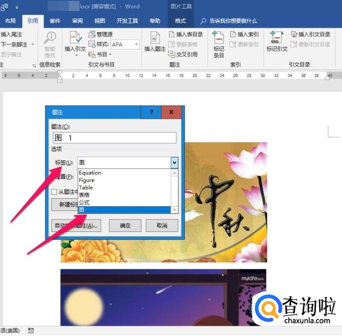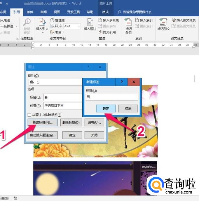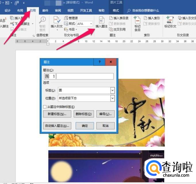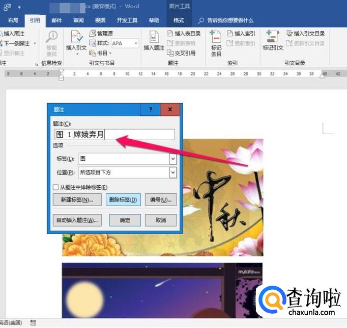 图片的名称就在题注框里设置,将光标定位在题注框,直接输入图片名称,如“嫦娥奔月”,点击【确定】。第一张图片设置完成。