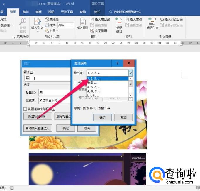选择第一张图片,开始设置自动编号图片,点击【引用】,在【题注】栏里找到【插入题注】